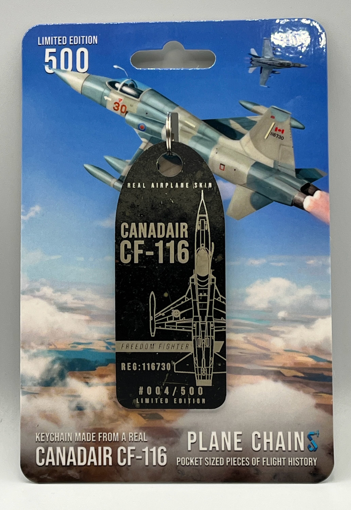These new Plane Chains are crafted from the tip tanks of RCAF CF-116 116730. Built in Montréal and powered by Canadian Orenda-built J85 engines, this twin-engine supersonic jet trained generations of Canadian fighter pilots. Serving with squadrons like 419 “Moose,” it became part of Canada’s own Top Gun program—an aggressor and lead-in fighter that prepared pilots for CF-104 and CF-18 combat operations.