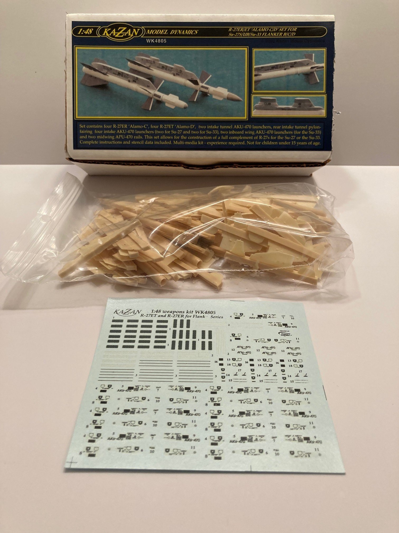 Old stock, never sold [but someone just had to open the box for a looksie ! ]. Weapon set for the Su27 or Su33, all resin with etch detail parts, full stencils [decal] & instructions. Intense set for the specialist !